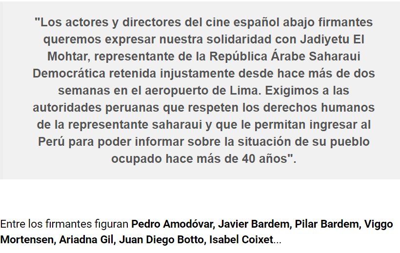 Javier Bardem envió mensaje de apoyo a saharaui que lleva 16 días sin poder entrar al PerúMarruecos niega pago de viaje a congresistas de Perú enfrentados con saharaui
