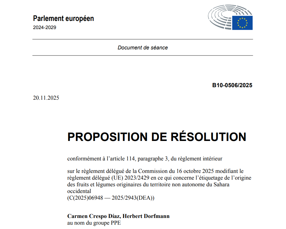 Le Parlement européen se réunit aujourd’hui, le 26/11/2025, de 12h00 à 13h00, pour voter un projet de résolution visant à rejeter les modifications introduites par la Commission européenne concernant l’étiquetage des produits importés du Sahara Occidental vers les marchés européens. Le texte soumis au vote, enregistré sous la référence B10-0506/2025, conteste la décision de la Commission d’autoriser que les fruits et légumes provenant du territoire occupé soient présentés comme originaires de « régions administratives » créées par le Maroc, au lieu d’indiquer leur véritable provenance : Sahara Occidental, un territoire non autonome dont le statut est distinct et séparé du Royaume du Maroc, comme le reconnaissent les Nations unies et comme l’a confirmé à plusieurs reprises la jurisprudence de la Cour de justice de l’Union européenne.