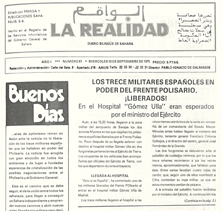 El 10 de septiembre de 1975, el diario La Realidad, el único bilingüe español-árabe que ha existido en el Sáhara Occidental y que se había fundado tan solo unos pocos meses antes por Pablo-Ignacio de Dalmases, abría con el siguiente titular: “LOS TRECE MILITARES ESPAÑOLES EN PODER DEL FRENTE POLISARIO, ¡LIBERADOS!”[1] Se trataba de los militares integrantes de las patrullas Pedro y Domingo, ambas de la Agrupación de Tropas Nómadas, que fueron hechos prisioneros por el Polisario en el mes de mayo anterior.