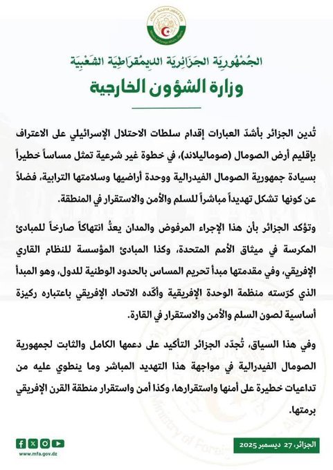 La República Argelina Democrática y Popular condena, en los términos más enérgicos, la decisión de las autoridades de la ocupación israelí de reconocer a la región de Somalilandia (“Tierra de Somalia”) como Estado, en una iniciativa ilegal que constituye un grave atentado contra la soberanía de la República Federal de Somalia, la unidad de su territorio y su integridad territorial. Además, supone una amenaza directa para la paz, la seguridad y la estabilidad en la región.