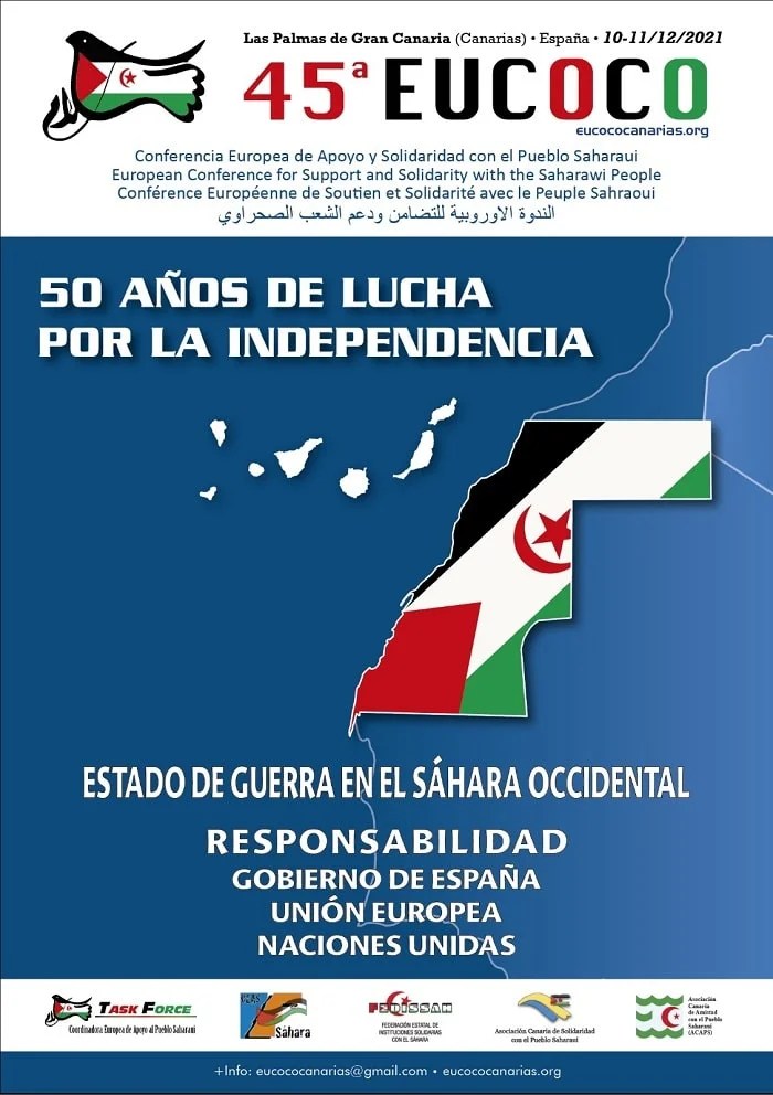 La Conferencia Europea de Apoyo al pueblo saharaui, EUCOCO, organizada cada año en una ciudad europea desde 1975, el año del comienzo de la ocupación, se celebra este año bajo el lema: “50 años de lucha por la independencia del Sáhara Occidental. “Estado de Guerra en el Sáhara Occidental: Responsabilidad del gobierno de España, Unión Europea y Naciones Unidas”.