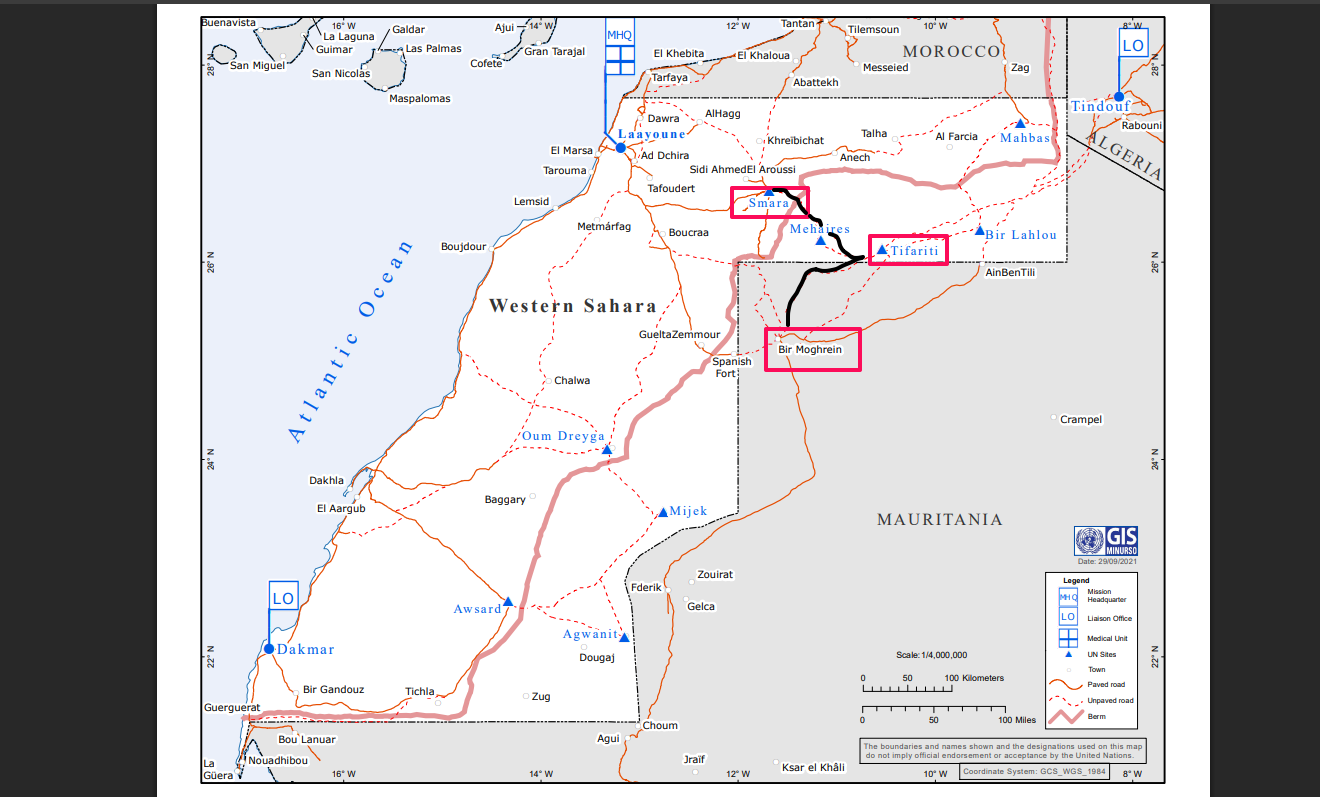 Dans cette lettre, Ghali souligne que « la MINURSO a observé que le Maroc avait achevé la construction d’une route d’environ 93 km reliant Smara à la Mauritanie à travers le mur de sable, non encore inaugurée officiellement, et qui offrira un second passage du territoire vers la Mauritanie, en plus de celui de Guerguerat ».