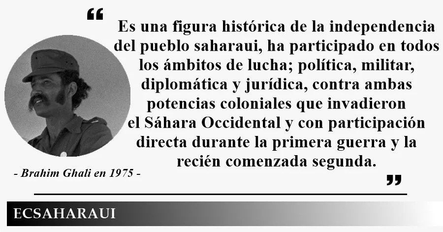 Brahim Ghali, el líder saharaui que incomodó tanto a España como Marruecos. El actual presidente de la RASD y Secretario General del Frente Polisario pasó de policía territorial de la España colonial a líder y primer Secretario General del Movimiento Saharaui que busca la independencia de la última colonia de África. Ghali dirigió en 1973 el movimiento saharaui, recién nacido, contra la presencia colonial española, y luego contra la doble ocupación de Marruecos y Mauritania. Durante 16 años, dirigió y supervisó con gran talento militar una guerra feroz contra estas dos fuerzas tras el abandono unilateral de España, obligándolas a reconocer al Frente Polisario como el único representante legítimo del pueblo saharaui así como el derecho de los saharauis a la autodeterminación e independencia.