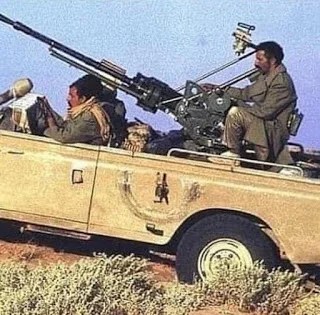 Foto del actual presidente de la RASD durante la primera guerra, a bordo de un Land Rover manejando el cañón antiaéreo 23. |