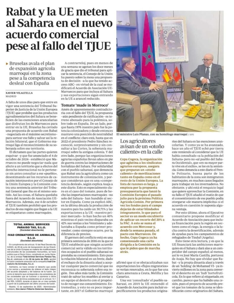 «La UE incluye al Sáhara en el nuevo acuerdo comercial con Marruecos pese al fallo del TJUE»: la publicación de ABC, con este título, sobre la inclusión del Sáhara Occidental en el nuevo acuerdo comercial entre la Unión Europea y Marruecos confirma lo que organizaciones agrarias, juristas y el propio pueblo saharaui venían denunciando: Bruselas está intentando bordear la sentencia del Tribunal de Justicia de la Unión Europea (TJUE) de octubre de 2024, que anuló expresamente la aplicación de esos acuerdos al territorio saharaui por falta de consentimiento de su pueblo.
