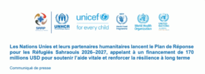 Naciones Unidas ha presentado el nuevo Plan de Respuesta para los Refugiados Saharauis 2026–2027, un llamamiento urgente a 177 millones de dólares que constata, una vez más, la prolongación de una crisis humanitaria que no debería existir. Cinco décadas después del éxodo forzado por la invasión marroquí de 1975, la comunidad internacional sigue sin abordar … Sigue leyendo Cincuenta años de exilio y ninguna solución política: la ONU pide fondos para sostener la vida de un pueblo abandonado por la comunidad internacional