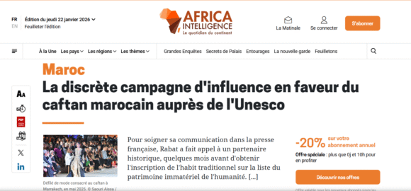 «La discrète campagne d’influence en faveur du caftan marocain auprès de l’Unesco» es el titular del artículo publicado por Africa Intelligence el 19 de enero de 2026. El medio especializado revela los mecanismos de influencia desplegados por Marruecos para lograr la inscripción del caftán marroquí como patrimonio cultural inmaterial de la humanidad, y ofrece claves … Sigue leyendo Cómo el régimen marroquí instrumentaliza la vestimenta: el caftán frente a Argelia y la melfa contra el Sáhara Occidental – Victoria G. Corera