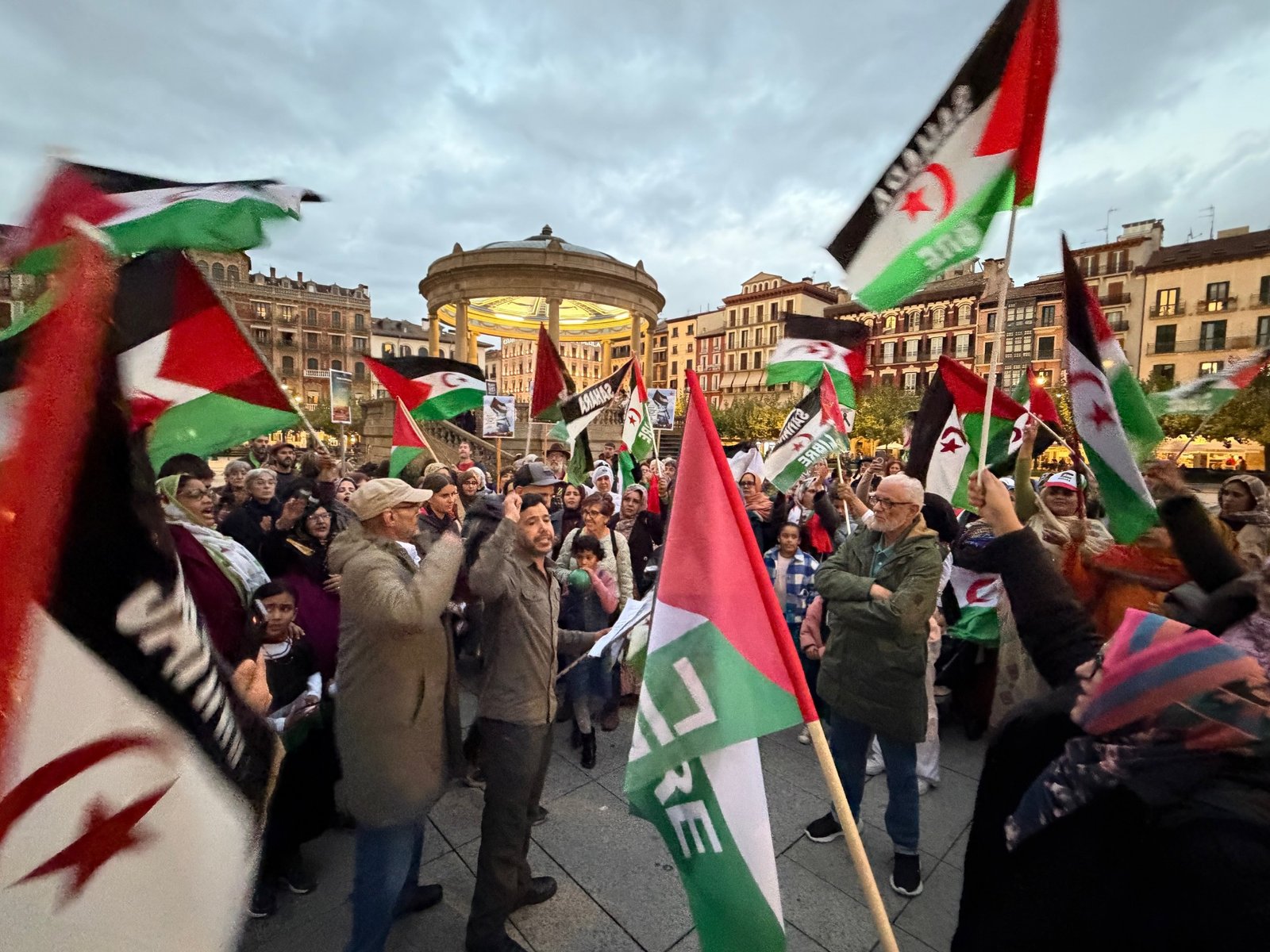 Gaur, Iruñeko Gaztelu plaza honetan, Sahararen aldeko gure konpromisoa berresten dugu, eta gure ahotsa altxatzen dugu ozenki: