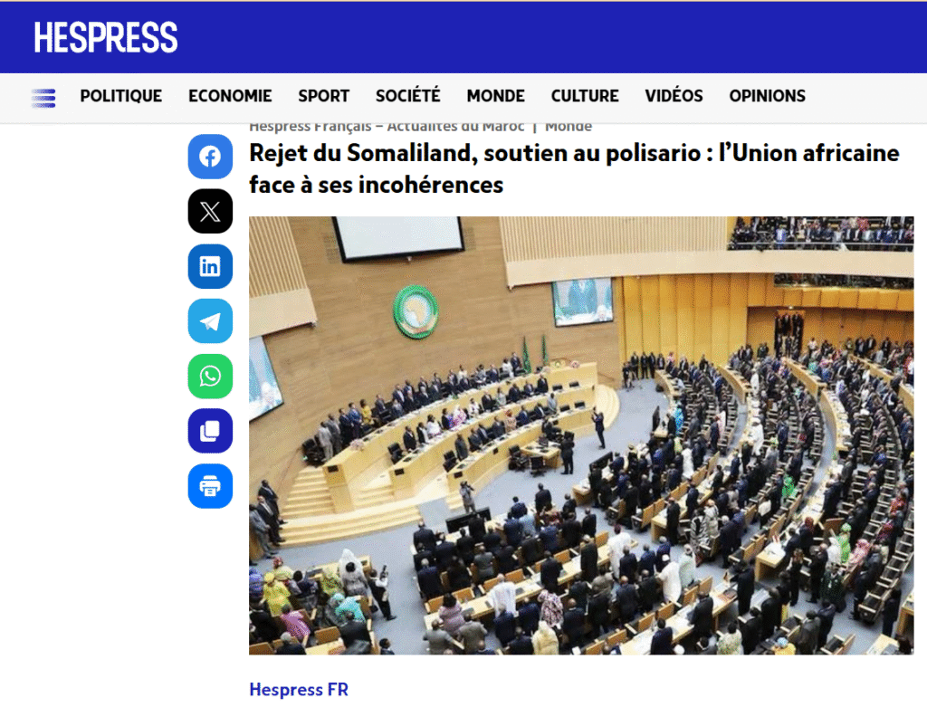 L’article publié le 30 décembre 2025 par Hespress, intitulé « Rejet du Somaliland, soutien au polisario : l’Union africaine face à ses incohérences » prétend analyser les contradictions de l’Union africaine à propos du Somaliland et du Sahara Occidental. En réalité, il s’inscrit dans une rhétorique bien connue : assimiler délibérément une question de décolonisation à un phénomène de séparatisme, afin d’en neutraliser la portée juridique et politique. Cette assimilation constitue le point de départ d’un raisonnement biaisé qui brouille volontairement les principes du droit international.