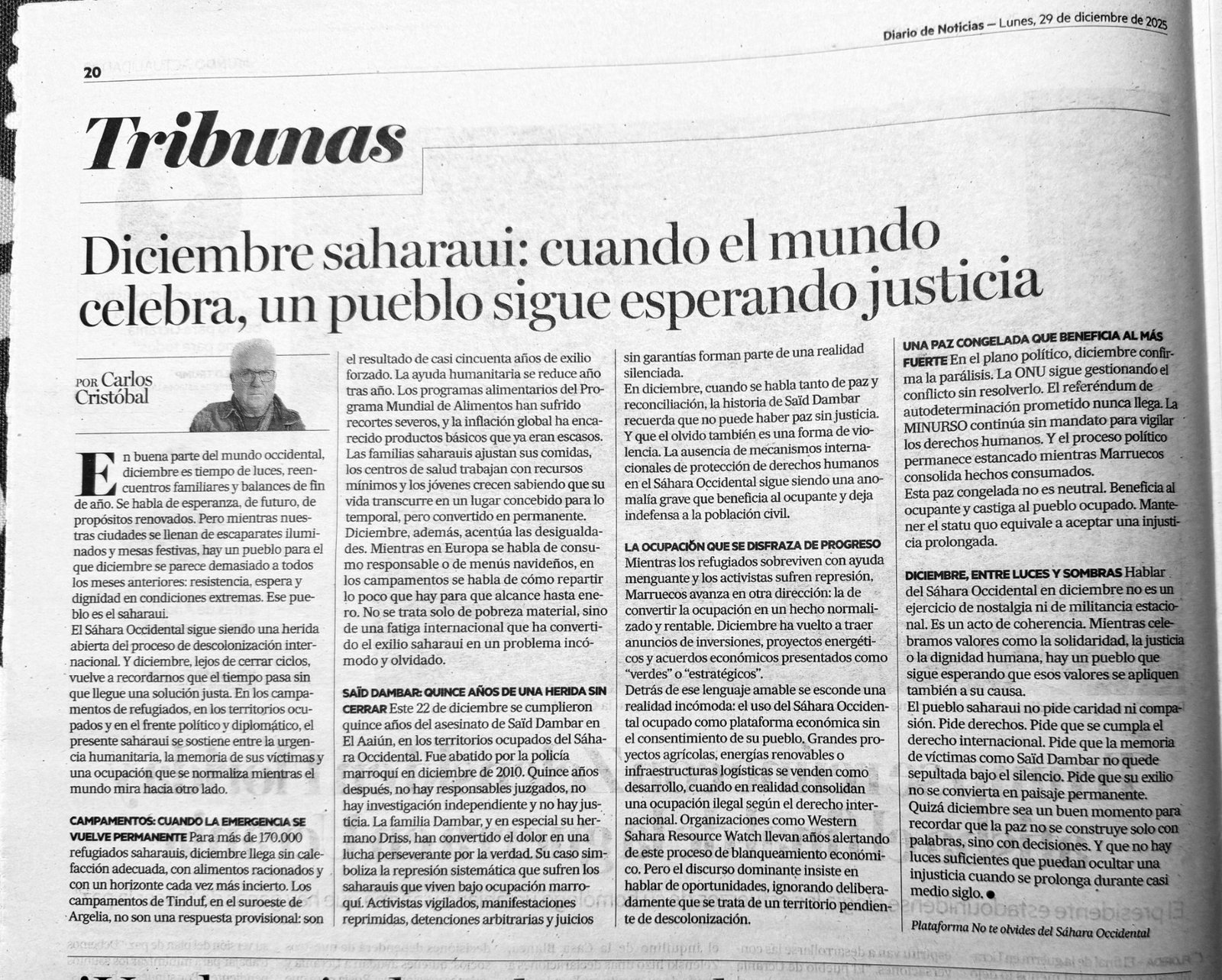 En diciembre, cuando se habla tanto de paz y reconciliación, la historia de Saïd Dambar recuerda que no puede haber paz sin justicia. Y que el olvido también es una forma de violencia. La ausencia de mecanismos internacionales de protección de derechos humanos en el Sáhara Occidental sigue siendo una anomalía grave que beneficia al ocupante y deja indefensa a la población civil.