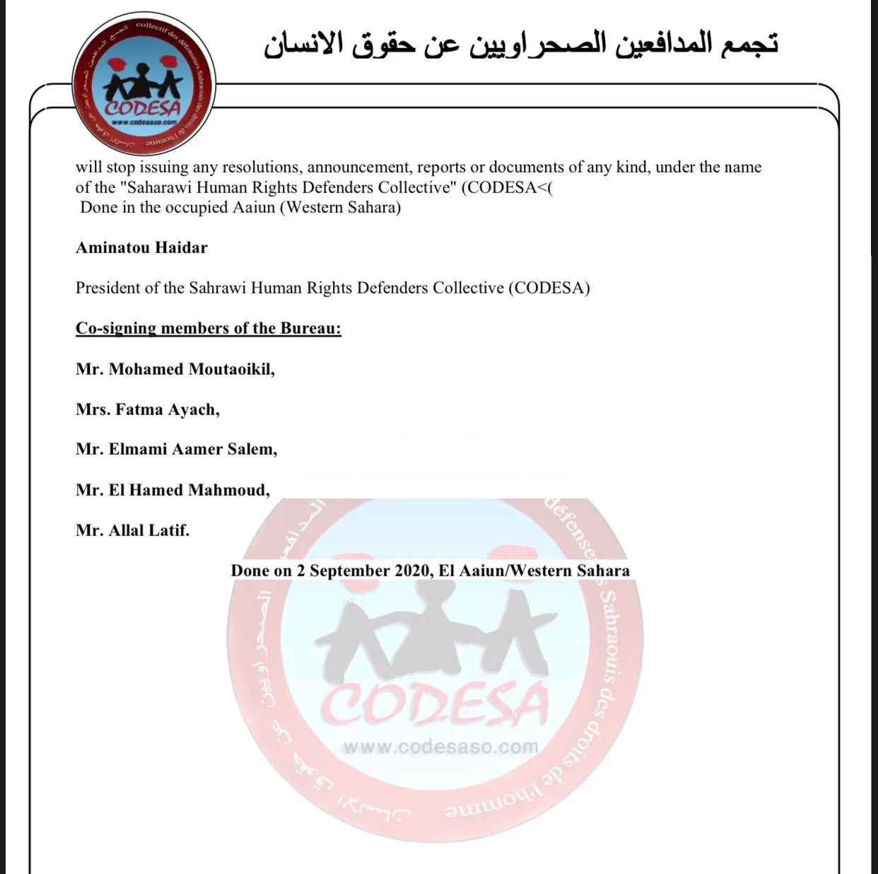 Por todos los motivos mencionados, y ante la imposibilidad de crear mejores condiciones que el statu quo, y dado que más de la mitad de sus integrantes reciben una clara expresión de deseo por la retirada definitiva del encuentro, quisiera agradecer a mi compañera y a mis compañeras por todo el esfuerzo que realizaron a lo largo de nuestro trabajo conjunto en el marco de la Oficina Ejecutiva de la CODESA. Y atendiendo a la voluntad de la mayoría absoluta de los miembros, ya no tengo, en mi calidad de presidente de la Asociación Saharaui de Defensores de Derechos Humanos «CODESA», de dar a conocer mi voz a sus voces que desean retirarse definitivamente de esta organización, considerando que nuestra comunicación constituye una declaración legal y oficial de disolución de los Defensores y defensoras de derechos humanos saharauis (CODESA), como la opción más segura aceptada por la mayoría absoluta de los integrantes de este marco saharaui de derechos humanos, considerando esta declaración una posición colectiva de los afiliados, dado que fue emitida por la mayoría absoluta de los integrantes de la Oficina Ejecutiva de CODESA.