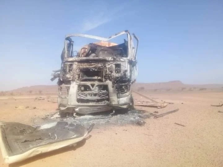 Birlehlu (Sáhara Occidental).- Las Fuerza de ocupación marroquíes atacaron con un misil lanzado por un dron turco a un camión cisterna de transporte de agua potable para la poca población nómada que queda en los territorios liberados del Sáhara Occidental. Este ataque, el séptimo de su tipo contra un objetivo civil, dejó al menos dos mártires.