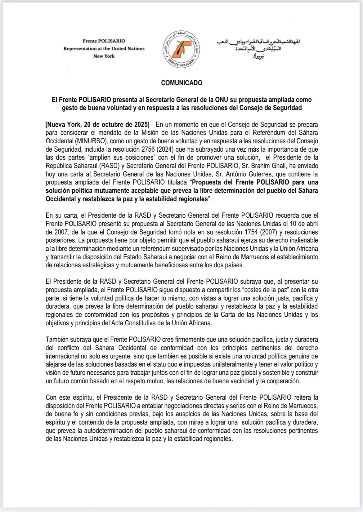 Nueva York (Naciones Unidas) 21 de octubre de 2025 (SPS) – En un momento en que el Consejo de Seguridad se prepara para considerar el mandato de la Misión de las Naciones Unidas para el Referéndum del Sáhara Occidental (MINURSO), como un gesto de buena voluntad y en respuesta a las resoluciones del Consejo de Seguridad, incluida la resolución 2756 (2024) que ha subrayado una vez más la importancia de que las dos partes “amplíen sus posiciones” con el fin de promover una solución, el Presidente de la República Saharaui (RASD) y Secretario General del Frente POLISARIO, Sr. Brahim Ghali, ha enviado el lunes una carta al Secretario General de las Naciones Unidas, Sr. António Guterres, que contiene la propuesta ampliada del Frente POLISARIO titulada “Propuesta del Frente POLISARIO para una solución política mutuamente aceptable que prevea la libre determinación del pueblo del Sáhara Occidental y restablezca la paz y la estabilidad regionales”.