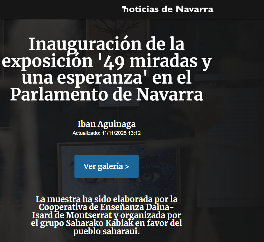 El Presidente del Parlamento de Navarra, Unai Hualde, ha inaugurado hoy la exposición Sáhara Occidental: 49 miradas y una esperanza / 49 begirada eta itxaropen bat, una muestra que aúna un proyecto fotográfico y otro de artes plásticas para realizar un recorrido por los cincuenta años de conflicto en el Sahara Occidental. Por un lado, la exposición acoge 49 obras plásticas realizadas por el alumnado de la cooperativa de enseñanza Daina-Isard de Olesa de Montserrat e impulsado por la red de bibliotecas y bibliobuses en los campamentos Bubisher y, por otro, se expone una muestra de la Memoria Gráfica del Pueblo Saharaui, un trabajo de recopilación y restauración de fotografías tomadas antes, durante y posteriormente a la época colonial realizado por la asociación Alouda Cantabria.
