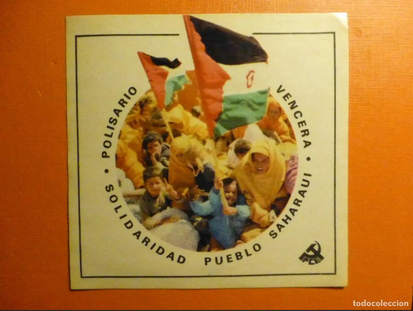 La posición no quedó solo en papel. En esos mismos meses circularon octavillas, panfletos y pegatinas comunistas con lemas como «¡Fuera Marruecos del Sáhara!», «Polisario vencerá» o «Sáhara: autodeterminación ya», distribuidas en ámbitos sindicales, universidades y actos de solidaridad. Una pegatina del PCE con el lema “Polisario vencerá” está documentada en colecciones de cartelería política de la Transición (ej.: Archivo Fundación 1º de Mayo – sección de propaganda visual, 1975-1976). Otras piezas similares pueden consultarse en exposiciones y fondos privados de militantes de la época.