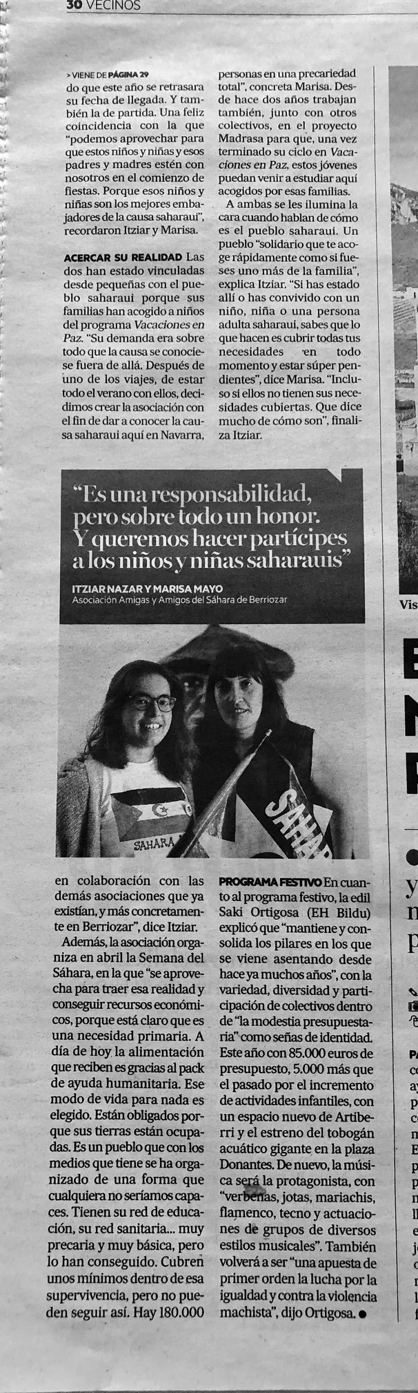 La prensa navarra ha recogido la noticia de que la Asociación de amigas y amigos del Sahara de Barriozar inaugurará las fiestas de la localidad con el lanzamiento del chupinazo el próximo día 28.