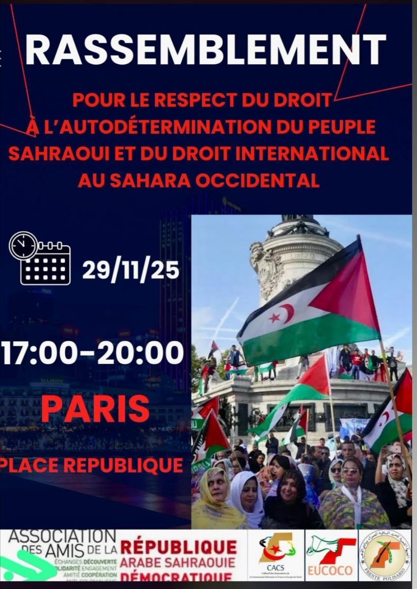 París , 29 de noviembre de 2025 (SPS) Varios centenares de personas participaron este sábado en París en una manifestación de apoyo al pueblo saharaui, organizada al final de los trabajos de la 49ª conferencia de la Coordinadora Europea de Apoyo y Solidaridad con el Pueblo Saharaui (Eucoco).