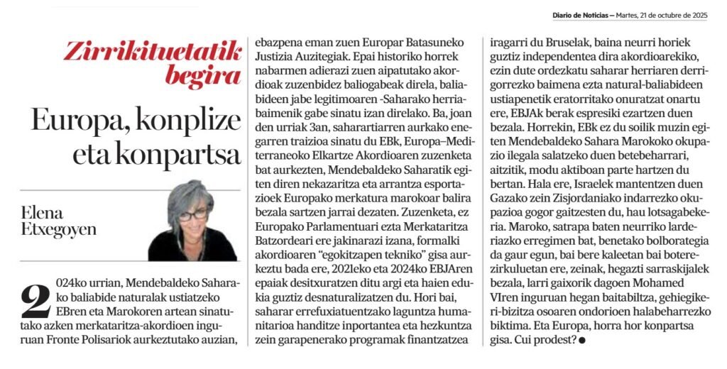 En su artículo de opinión «Europa, konplize eta konpartsa» (Europa, cómplice y comparsa), Elena Etxegoyen denuncia la «enésima traición» de la Unión Europea (UE) al pueblo saharaui, señalando que la UE ha burlado la sentencia histórica del TJUE de octubre de 2024 —que declaró nulos los acuerdos comerciales con Marruecos por explotar recursos del Sáhara Occidental sin el consentimiento del legítimo propietario— al aprobar el pasado 3 de octubre una enmienda que permite a las exportaciones agrícolas y pesqueras del Sáhara seguir entrando en el mercado europeo como si fueran marroquíes. Etxegoyen critica que esta «adaptación técnica», no notificada a los órganos pertinentes, desnaturaliza el fallo judicial y convierte a Europa en «comparsa» activa de la ocupación ilegal de Marruecos, evidenciando una «lotsagabekeria» (desvergüenza) al condenar otras ocupaciones, como la israelí en Gaza y Cisjordania, mientras se ignora la del Sáhara Occidental.