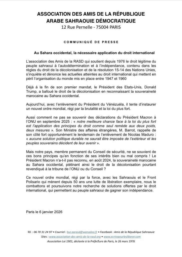 El comunicado interpela de manera explícita a Francia y a su presidente, Emmanuel Macron, recordando la contradicción entre los discursos pronunciados en Naciones Unidas en defensa del derecho internacional y el reconocimiento de la soberanía marroquí sobre el Sáhara Occidental en 2024. Frente a esta incoherencia, la asociación reafirma la vigencia del derecho del pueblo saharaui a la autodeterminación y sitúa su lucha, junto al Frente Polisario, como una resistencia prolongada y legítima frente a un nuevo orden internacional basado en la fuerza y no en el derecho.