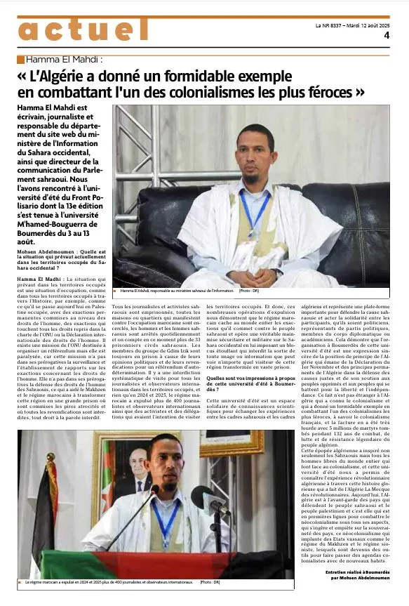 Boumerdès, agosto de 2025 — En declaraciones recogidas por el periódico argelino La Nouvelle République, el escritor y periodista saharaui Hamma El Mahdi denunció la grave situación de los derechos humanos en los territorios ocupados del Sáhara Occidental y elogió el ejemplo histórico de Argelia en su lucha contra el colonialismo. La entrevista fue realizada por el periodista Mohsen Abdelmoumen durante la 13.ª Universidad de Verano del Frente Polisario, celebrada en la Universidad M’hamed-Bouguerra de Boumerdès del 3 al 13 de agosto.