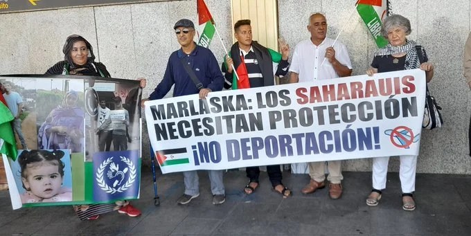 FOTO: contramutis @contramutis | Saharauis, con la madre de la mujer retenida en Barajas con su hija de año y medio que se encuentra enferma, en apoyo de los activistas saharauis en su tercer día de huelga de hambre para que se les conceda asilo