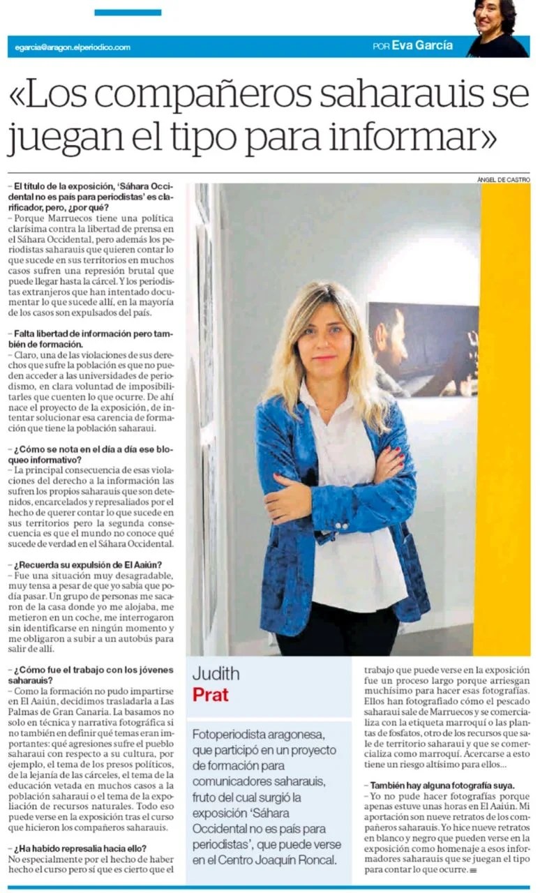 Judith Prat, fotoperiodista aragonesa, participó en un proyecto de formación para comunicadores saharauis, organizado por el Observatorio aragonés para el Sáhara Occidental, con la colaboración del Ayuntamiento de Zaragoza. Fruto de ese trabajo surgió la exposición Sáhara Occidental no es país para periodistas, que puede verse en el Centro Joaquín Roncal de la Fundación CAI hasta el 14 de noviembre.
