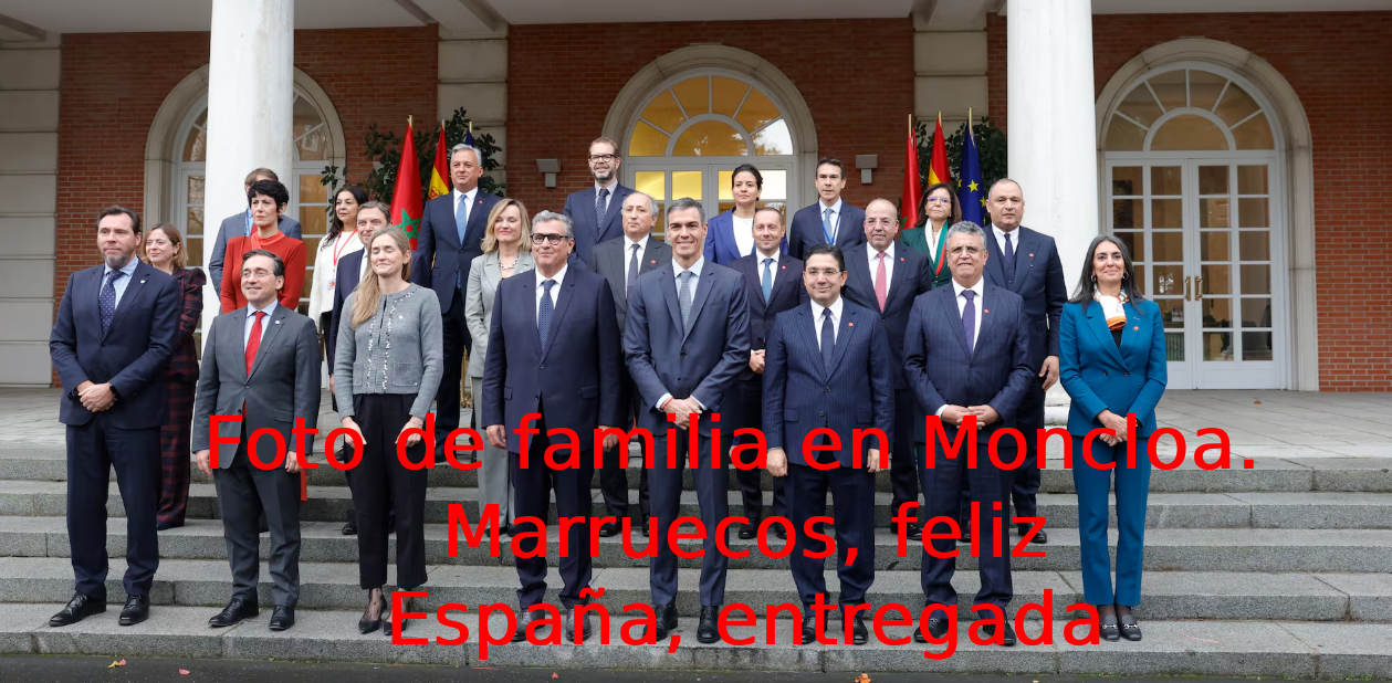 La foto oficial de la XIII RAN España–Marruecos muestra un posado impecable y cuidadosamente orquestado. Una “familia feliz” en la escalinata de Moncloa que proyecta armonía mientras oculta la renuncia más grave de la política exterior española: abandonar la legalidad internacional sobre el Sáhara Occidental. España posa satisfecha junto a la potencia ocupante evitando toda mención a la autodeterminación, la represión en los territorios ocupados y su responsabilidad como potencia administradora.