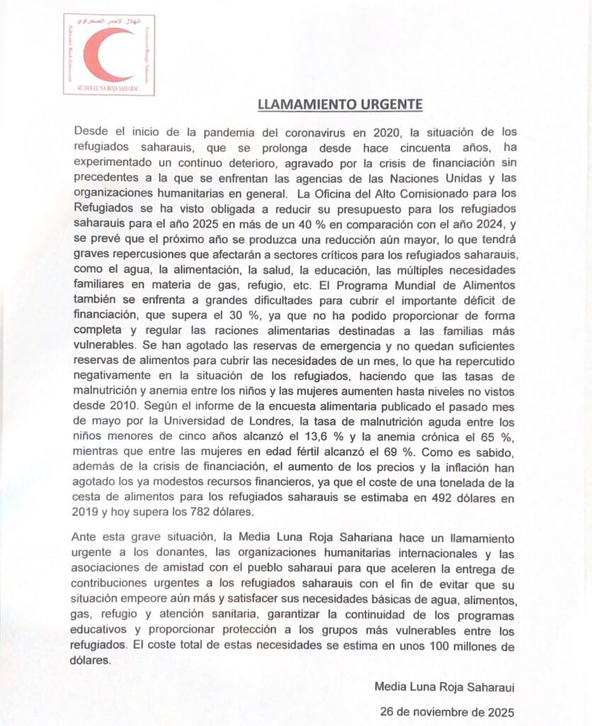 La Media Luna Roja Saharaui ha emitido un llamamiento urgente ante el deterioro extremo de las condiciones de vida en los campamentos de refugiados. Tras cincuenta años de exilio y un recorte sin precedentes en la financiación internacional, la comunidad refugiada afronta una crisis humanitaria crítica: falta de alimentos, agotamiento de reservas, aumento alarmante de la malnutrición infantil y un desplome de los recursos básicos que pone en riesgo inmediato a miles de familias. El mensaje es claro: sin una respuesta urgente, la situación puede desbordarse.