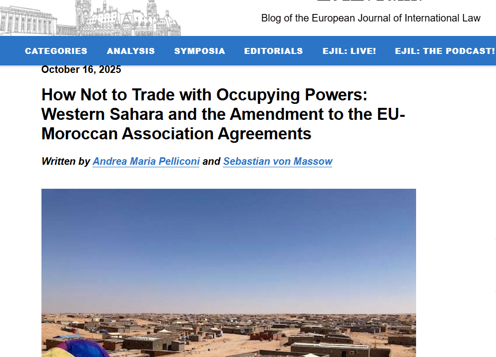 Artículo basado en el análisis jurídico de Andrea Maria Pelliconi y Sebastian von Massow , publicado el 14 de octubre de 2025 en EJIL:Talk!, Blog of the European Journal of International Law– How Not to Trade with Occupying Powers: Western Sahara and the Amendment to the EU-Moroccan Association Agreements Una enmienda contra el derecho internacional … Sigue leyendo La UE vuelve a traicionar al pueblo saharaui: la enmienda al Acuerdo de Asociación con Marruecos legaliza el expolio