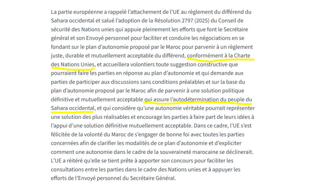 Là où certains titres évoquent un soutien européen à la « marocanité du Sahara », le texte officiel ne mentionne à aucun moment la souveraineté du Maroc sur le territoire ni son intégration à son intégrité territoriale. Le Sahara occidental continue d’être traité comme un différend en attente de solution, et non comme une question réglée ni comme un territoire reconnu comme marocain. L’absence de toute référence à une reconnaissance est aussi significative que délibérée et suffit, à elle seule, à déconstruire la narration triomphaliste diffusée ces dernières heures.