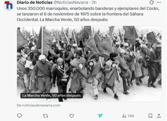 El diario Noticias de Navarra publica este 23 de noviembre un artículo titulado “La Marcha Verde, 50 años después”, firmado por Jon Artabe. Se trata de un texto que, pese a reconocer la tragedia sufrida por el pueblo saharaui desde 1975, presenta importantes omisiones y varios enfoques problemáticos que conviene revisar para comprender con rigor … Sigue leyendo LECTURA CRÍTICA DEL ARTÍCULO DE NOTICIAS DE NAVARRA SOBRE LA MARCHA VERDE: LO QUE SE DICE… Y LO QUE NO