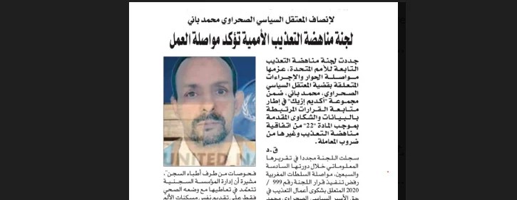 El Comité de Naciones Unidas contra la Tortura ha emitido un dictamen histórico en el que reconoce que el preso político saharaui Mohamed Bani, integrante del grupo de Gdeim Izik, fue víctima de tortura, malos tratos y confesiones arrancadas bajo coacción durante su detención y juicio en Marruecos.