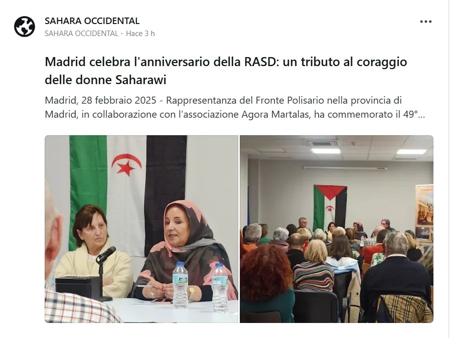 Madrid, 28 de febrero de 2025.- La Representación del Frente Polisario en la provincia de Madrid, en colaboración con la asociación Agora Martalas, conmemoró el 49 aniversario de la proclamación de la República Árabe Saharaui Democrática (RASD) con un significativo acto. Intelectuales, escritores y simpatizantes de la causa saharaui se reunieron para celebrar esta fecha histórica y debatir sobre el papel fundamental de la mujer saharaui en la construcción y el fortalecimiento de las instituciones del Estado.