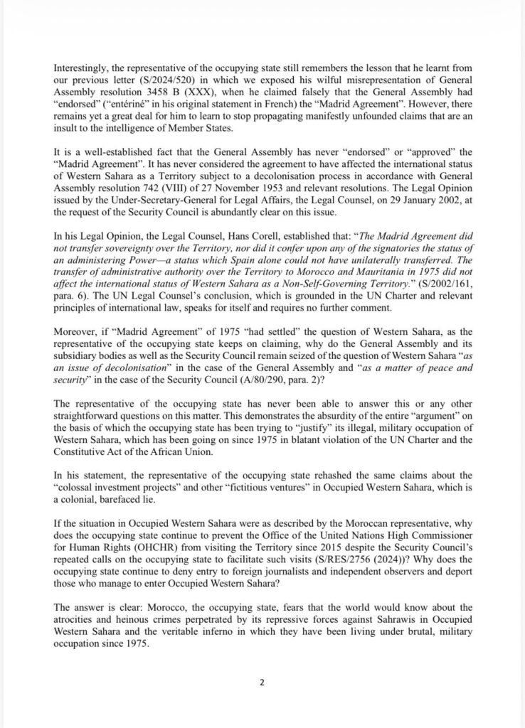 Otro punto esencial que desmiente la carta es la manipulación marroquí en torno al llamado Acuerdo de Madrid de 1975. Este pacto entre España, Marruecos y Mauritania jamás fue aprobado por la Asamblea General, ni alteró el estatuto jurídico internacional del Sáhara Occidental. Como recordó Omar citando la opinión jurídica de Hans Corell (ONU, 2002), España no podía transferir soberanía, y Marruecos nunca ha sido reconocido como potencia administradora. El Sáhara Occidental sigue siendo un territorio colonizado, cuya descolonización solo puede resolverse mediante el referéndum de autodeterminación.