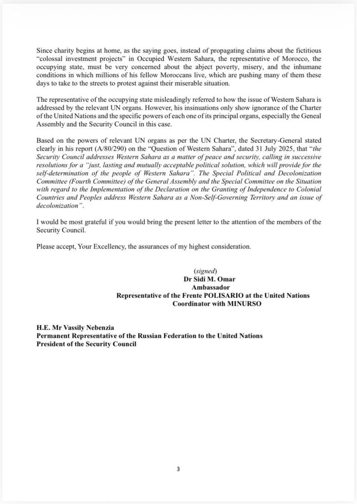 El representante del Frente Polisario ante Naciones Unidas, Dr. Sidi Mohamed Omar, ha vuelto a poner la verdad frente a la mentira. En una carta dirigida al embajador ruso Vassily Nebenzia, actual presidente del Consejo de Seguridad, el diplomático saharaui respondió con contundencia a las falsedades vertidas por Marruecos durante el Debate General de la Asamblea General de la ONU. Su mensaje es claro: la ocupación marroquí del Sáhara Occidental es ilegal, ilegítima e insostenible, y no hay propaganda que pueda cambiar ese hecho.