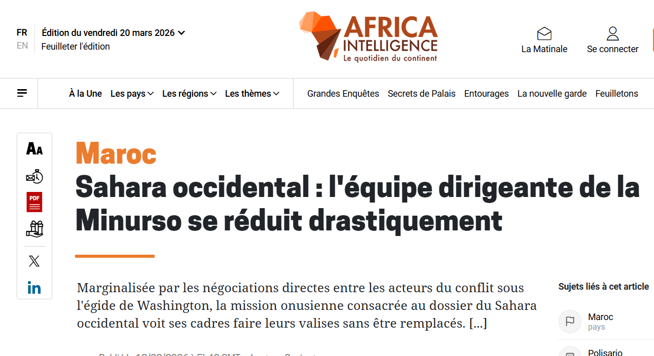 El artículo «Sahara occidental : l’équipe dirigeante de la Minurso se réduit drastiquement», publicado por Africa Intelligence el 18 de marzo de 2026, aborda un fenómeno que pasa más desapercibido en el debate público, pero que resulta clave para entender la evolución del conflicto: el debilitamiento interno de la MINURSO en paralelo a su pérdida de centralidad política.