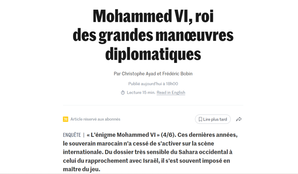 👉 Lire l’article complet (réservé aux abonnés) : Le Monde – Mohammed VI, roi des grandes manœuvres diplomatiques