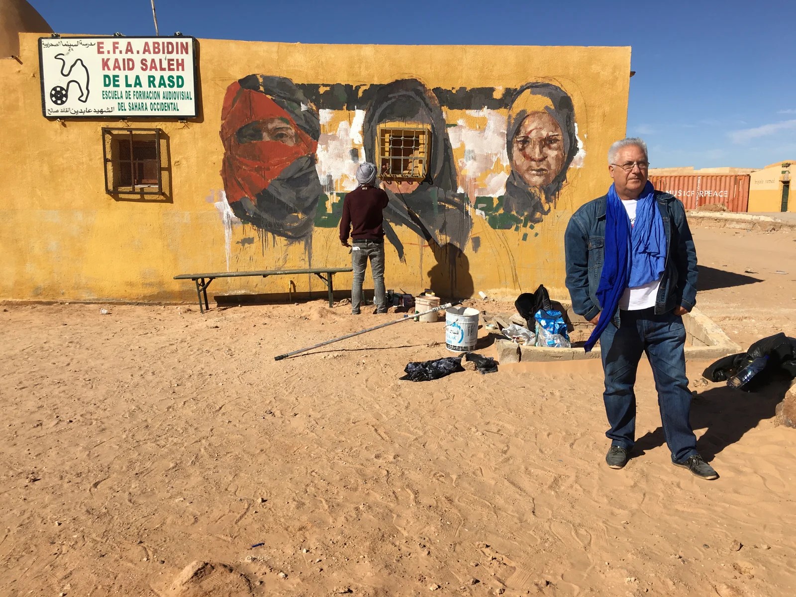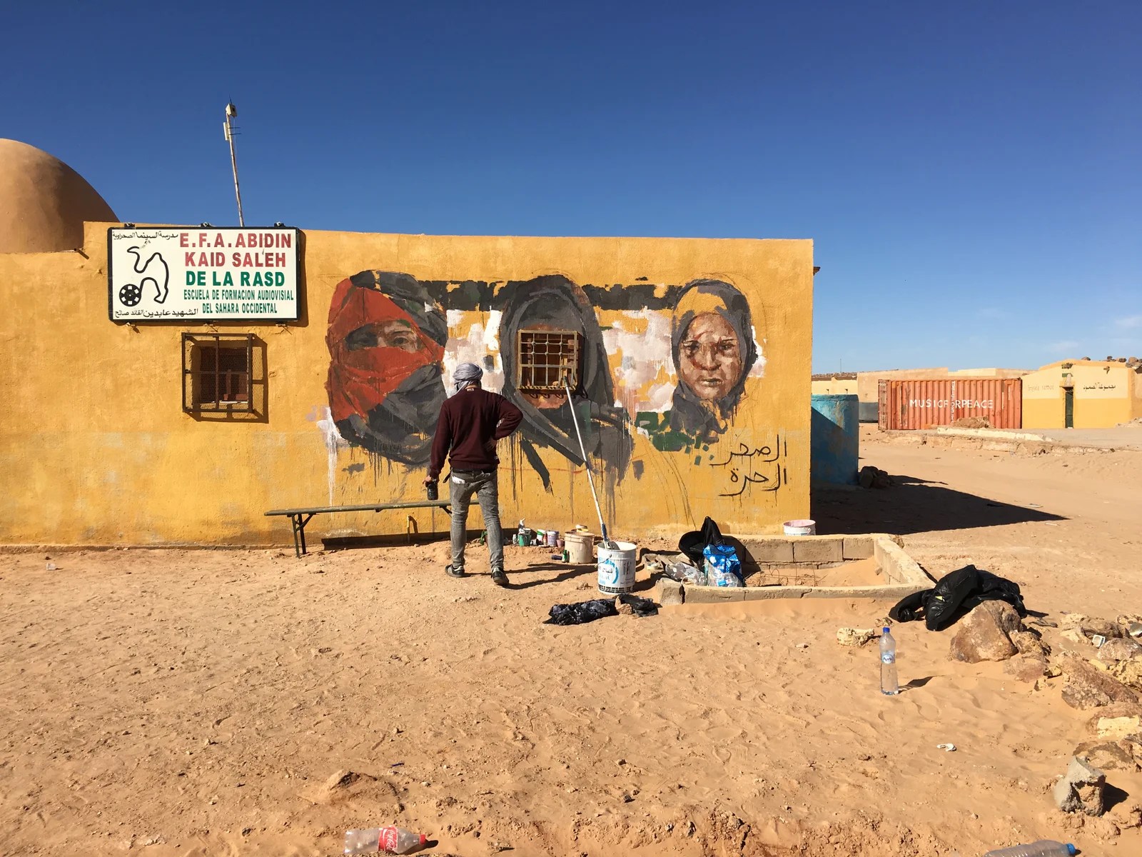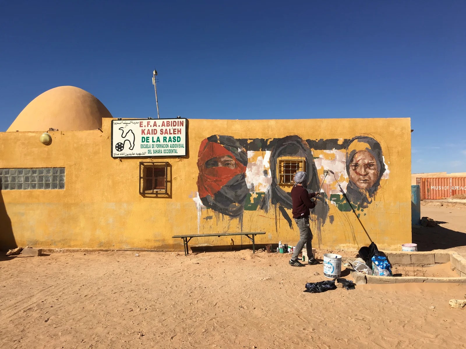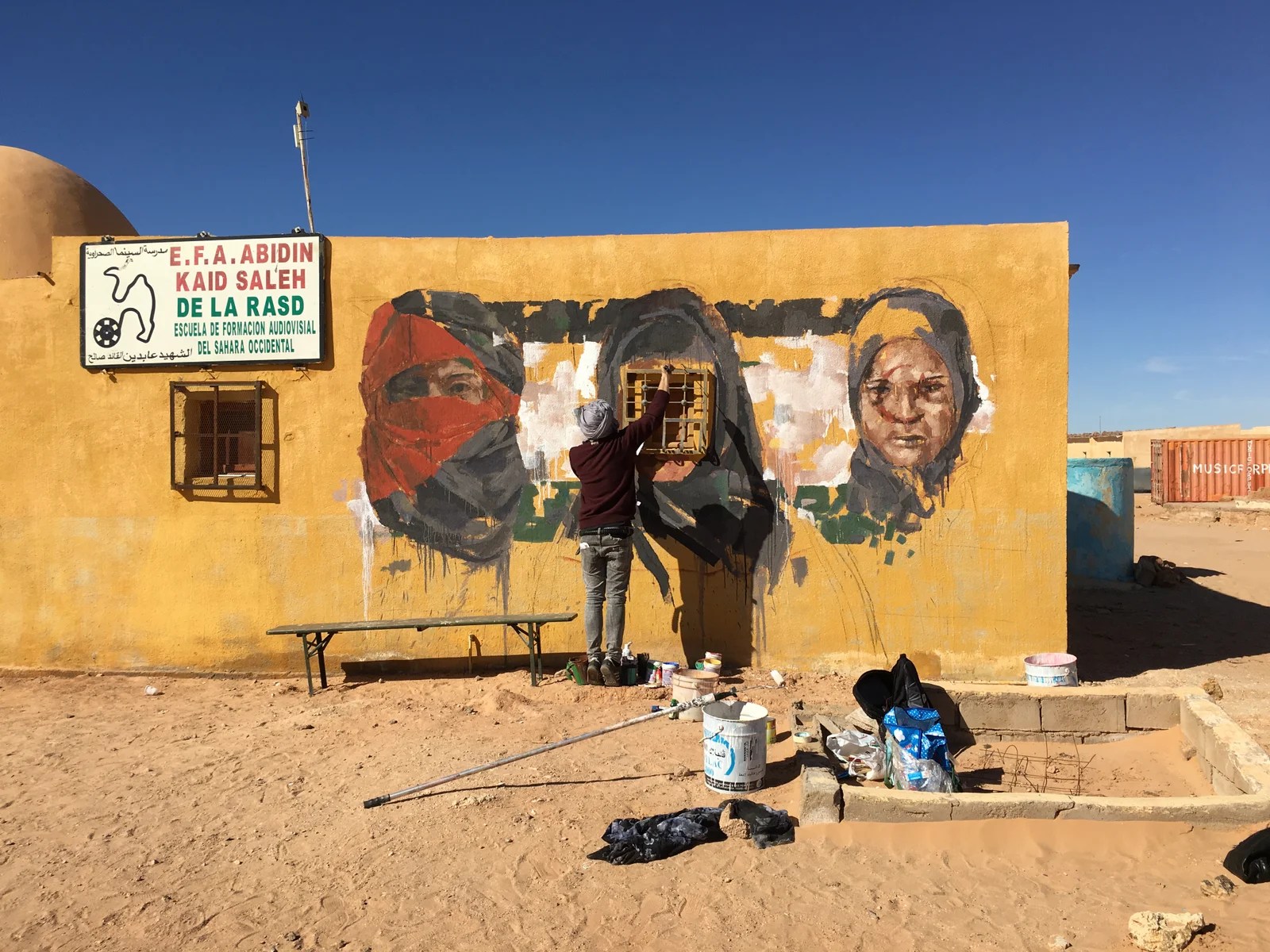 Para el recuerdo: El gran grafitero español GONZALO BORONDO trabaja en la fachada de la Escuela saharaui de Cine – diciembre 2015