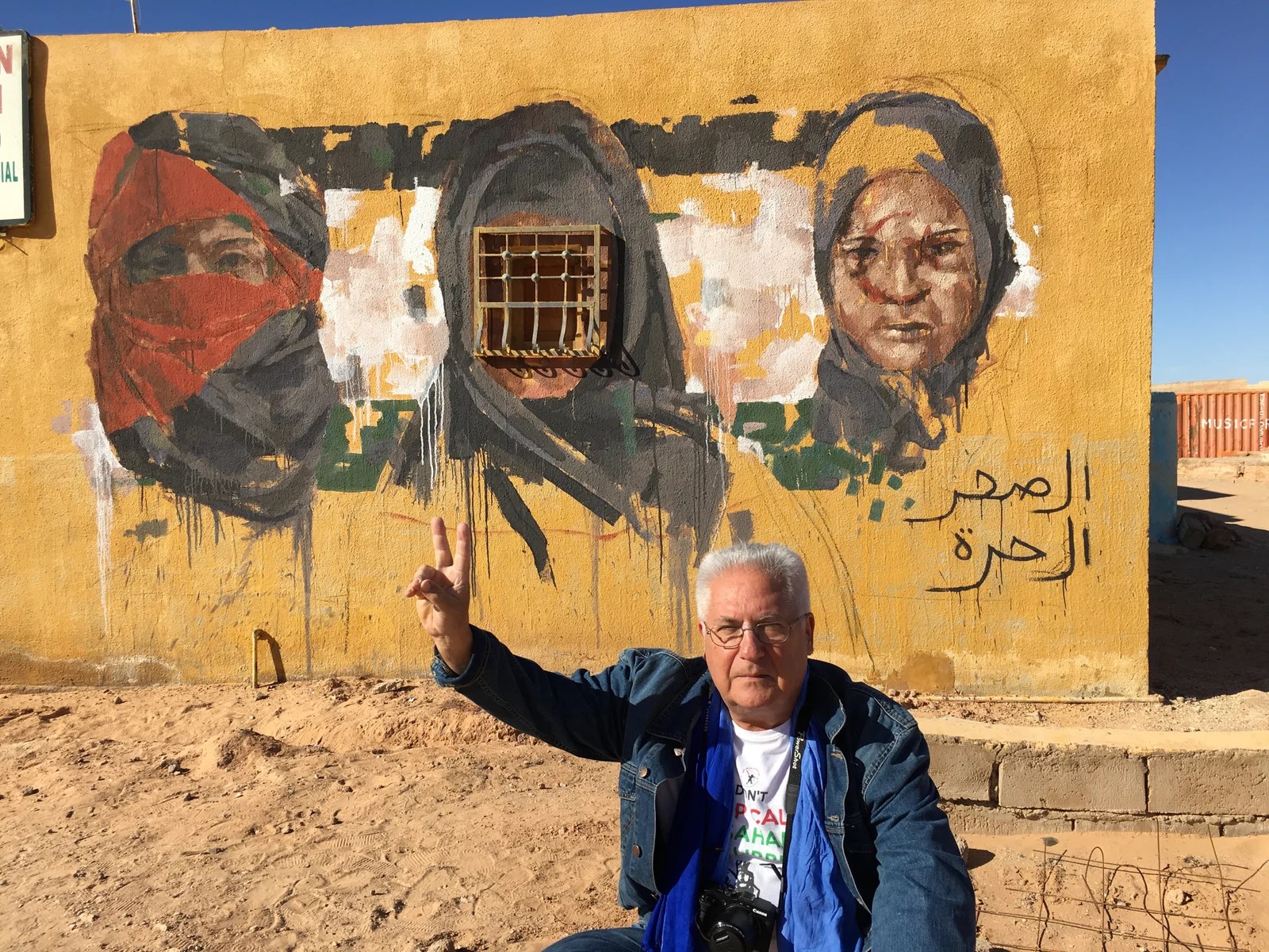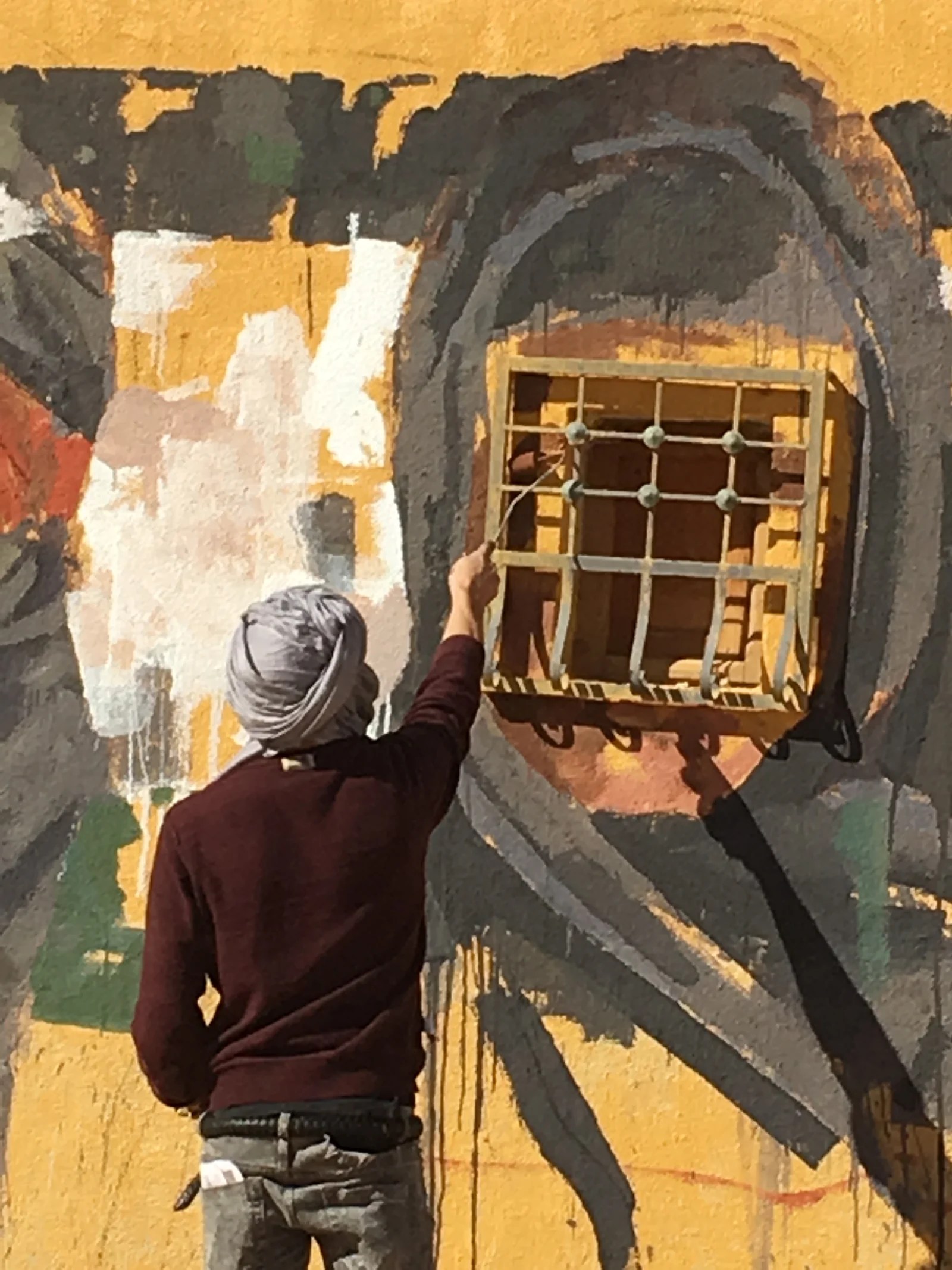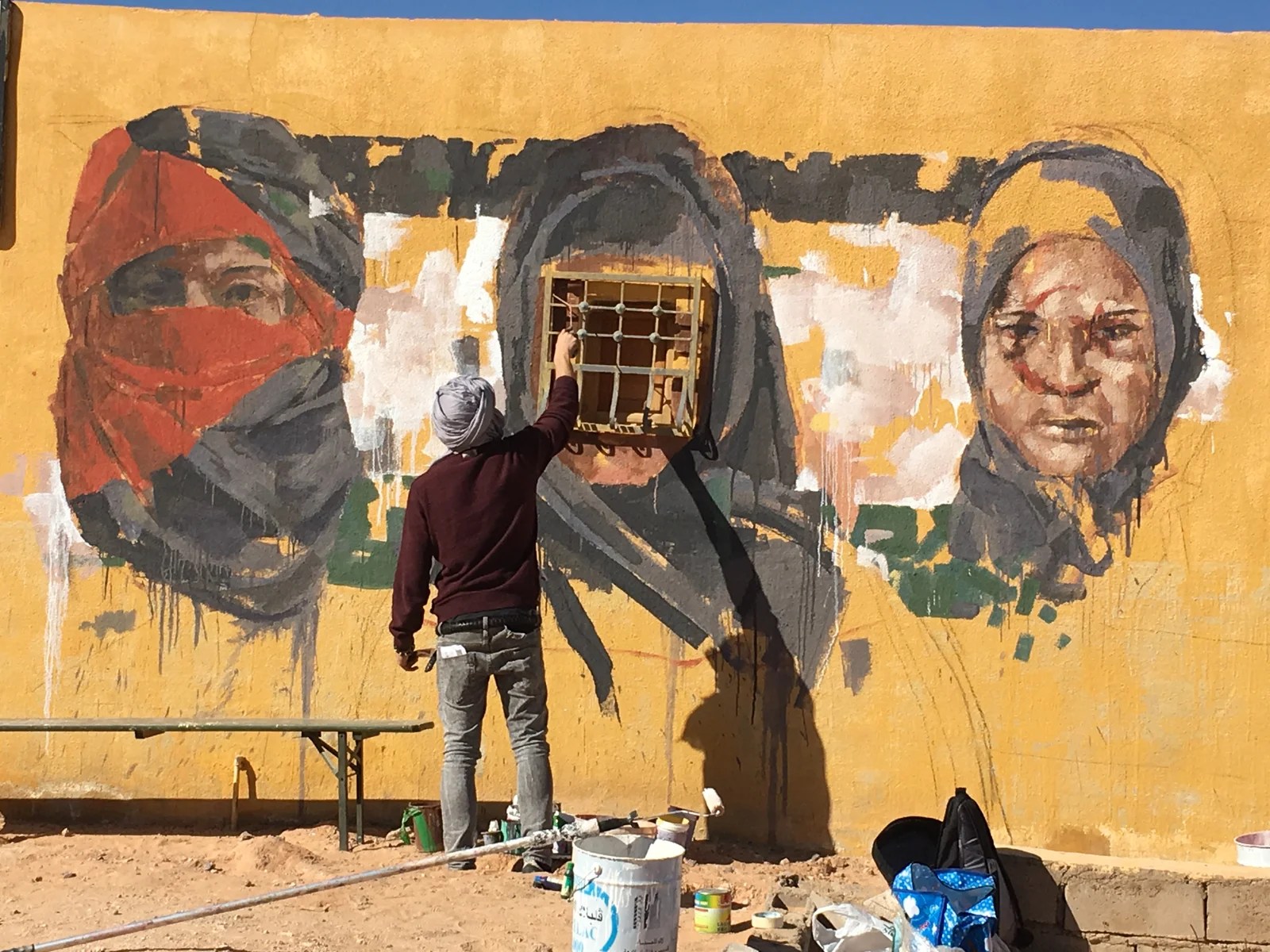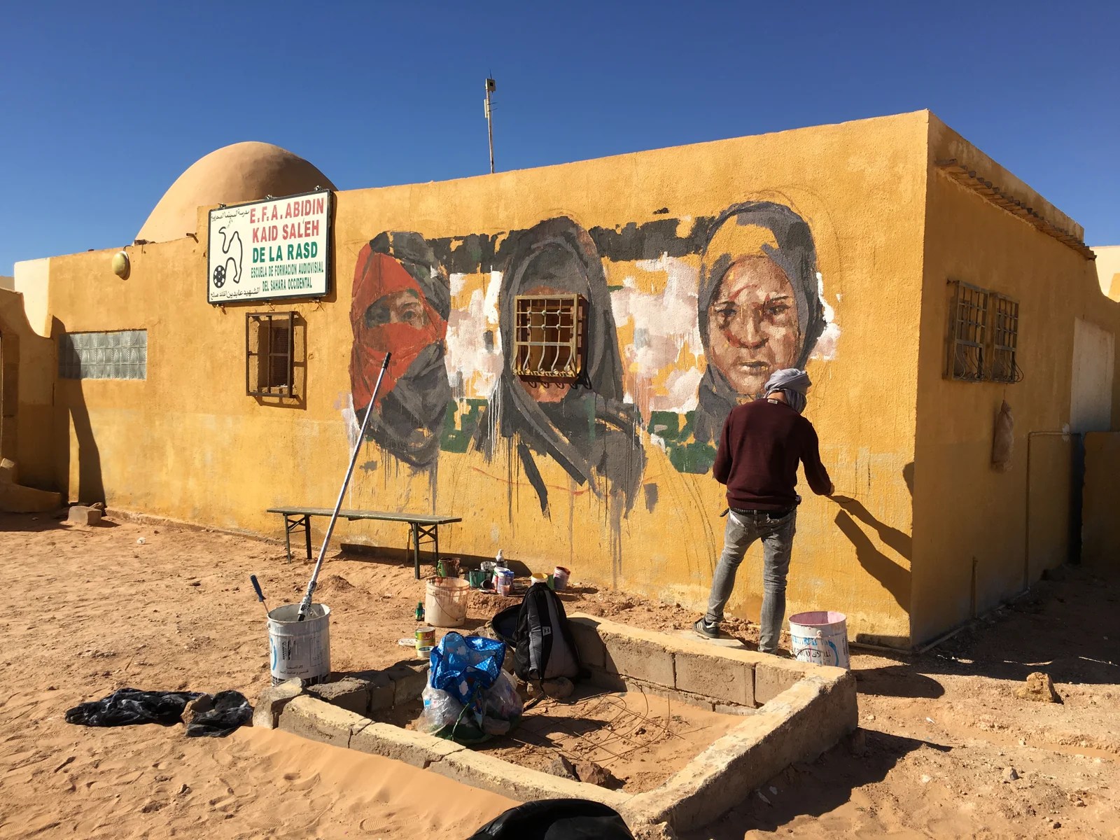 Para el recuerdo: El gran grafitero español GONZALO BORONDO trabaja en la fachada de la Escuela saharaui de Cine – diciembre 2015