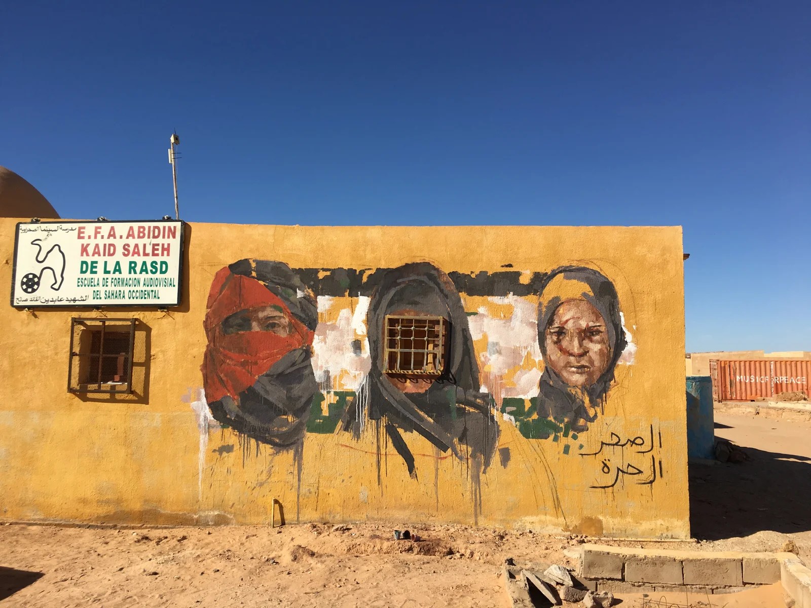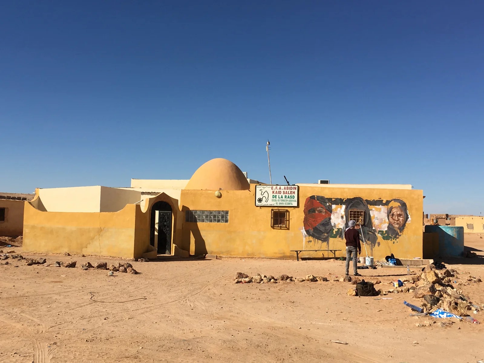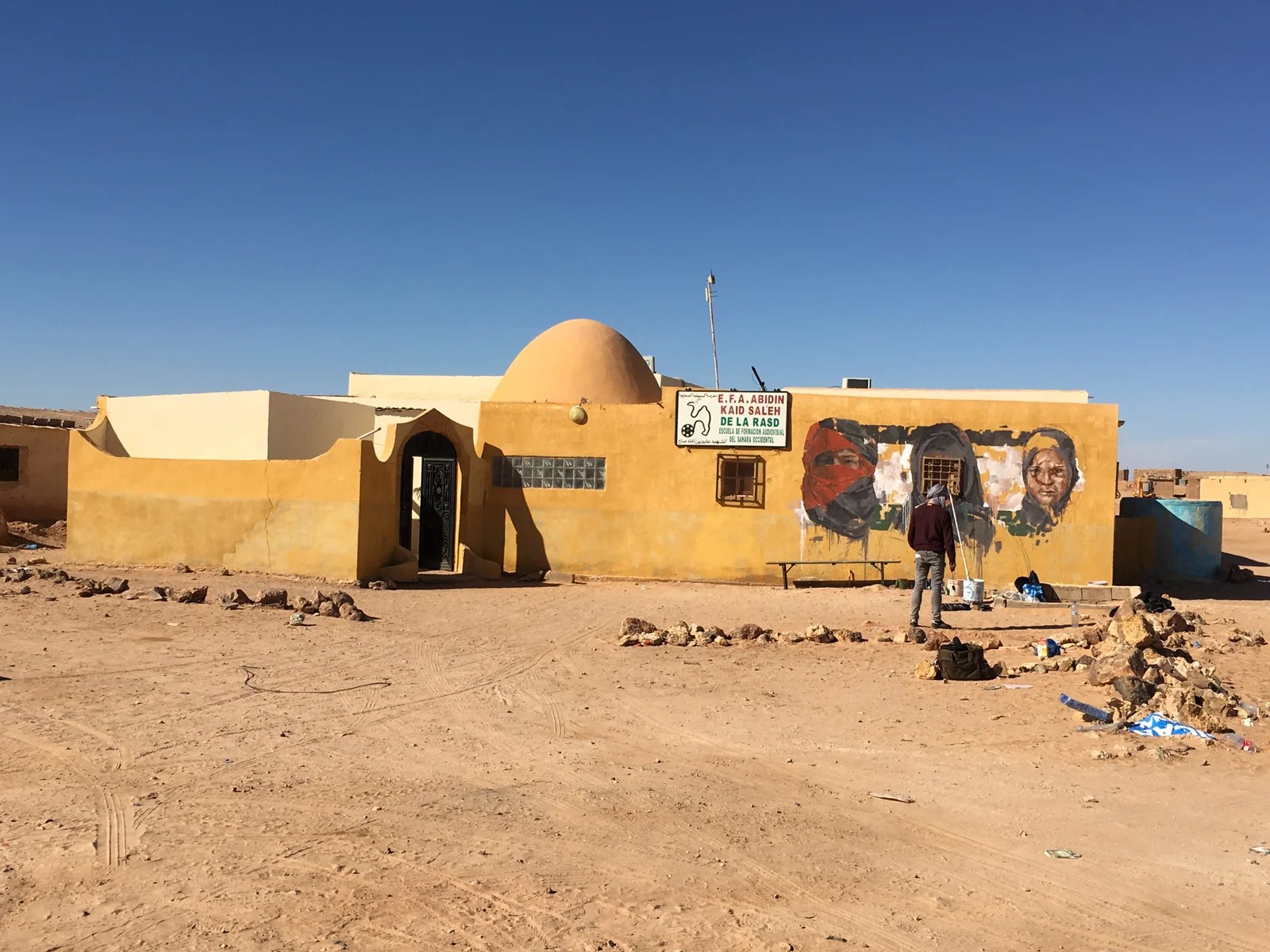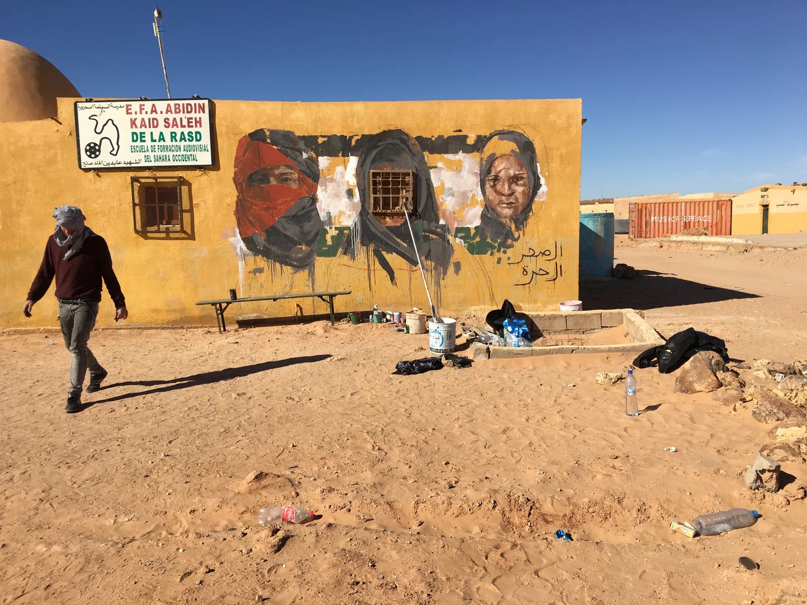 En las fotos, el gran grafitero Gonzalo Borondo trabajando en la fachada de la Escuela de Cine del Sahara… ¡el grafiti ya se lo ha llevado el siroco, la arena y las inclemencias del día a día en los campamentos de refugiados saharauis! Era diciembre del 2015 ???