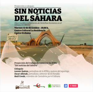 El próximo 12 de diciembre, el Centro Cultural La Residencia de Castro Urdiales acogerá a partir de las 19:00 horas la proyección del documental periodístico ‘Sin noticias del Sáhara’, una pieza audiovisual de la Radio Televisión del Principado de Asturias (RTPA) que documenta la expulsión de su equipo del Sáhara Occidental durante la pasada primavera mientras trataban de registrar la situación de los derechos humanos en el territorio saharaui que Marruecos viene ocupando desde hace medio siglo.