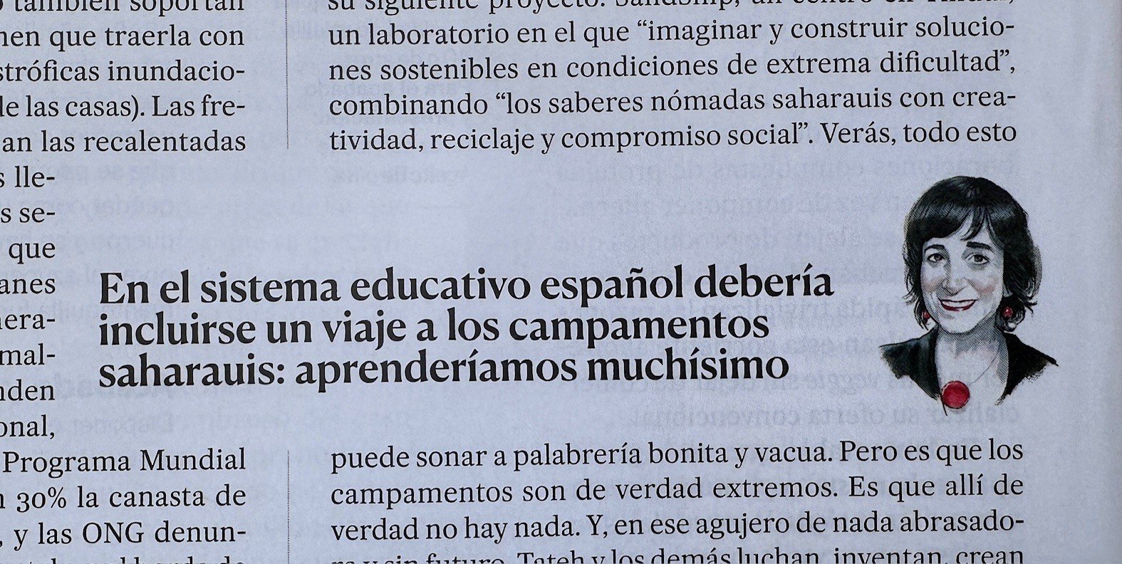 Cuento todo esto y me indigno, y sufro, y aborrezco el olvido en el que viven, pero también me maravillo y me embeleso por su resistencia, su vitalidad, su adaptabilidad, su inteligencia. En el sistema educativo español debería incluirse un viaje obligatorio a los campamentos: aprenderíamos muchísimo. Son capaces de crear vida, vida bella y buena, de la nada. Porque el entorno demoledor de los campamentos, feroz e inhumano, sigue originando sin embargo a unos seres humanos maravillosos. Como, por ejemplo, Tateh Lehbib, un saharaui de 35 años nacido en la hamada. A los 12 años tuvo que abandonar a su familia para poder estudiar en Argel; con becas de ACNUR y Erasmus cursó Ingeniería y Energías Renovables, y después hizo un máster en Eficiencia Energética en Las Palmas de Gran Canaria. Tras las inundaciones de 2015 regresó a la hamada con un proyecto de construir casas eficientes en zonas desérticas. Con fondos de ACNUR diseñó y levantó 25 viviendas en los campamentos arrasados. Están hechas con botellas de plástico rellenas de arena a modo de ladrillos, se pueden construir en una sola semana y además son más seguras frente a las tormentas de arena y las lluvias torrenciales. Esas casas se convirtieron en un notable mundial en el sector y le permitieron acceder a su siguiente proyecto: SandShip, un centro en Tinduf, en lo inhóspito de la nada, en el que “imaginar y construir soluciones sostenibles” con los recursos más extremados, combinando “los saberes nómadas saharauis con creatividad, reciclaje y compromiso social”. Verás, todo esto puede sonar a palabrería bonita y vacua. Pero es que los campamentos son de verdad extremos. Es que allí de verdad no hay nada. Y en ese agujero de nada abrasadora y sin futuro, Tateh y los demás luchan, inventan, crean, sobreviven y hasta prosperan. Son maestros en lograr lo imposible. El último proyecto de SandShip consiste en que una serie de artistas multidisciplinares elaboren piezas únicas de arte y diseño que luego serán elaboradas en los campamentos y exhibidas en foros internacionales. Lo cual servirá para visibilizar la causa saharaui y para fomentar redes artesanales sostenibles en Tinduf. Viven en el más absoluto desamparo, pero con una tenacidad y creatividad que admiran al mundo. Yo quiero que nuestro próximo presidente del Gobierno sea una saharaui.