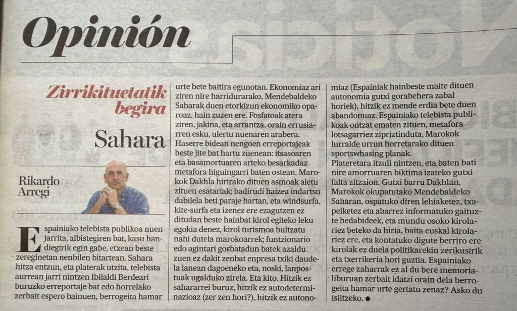 El poeta Rikardo Arregi reflexiona en este artículo —publicado en euskera en el Diario de Noticias— sobre el silencio y la amnesia que envuelven el abandono del Sáhara Occidental por parte de España hace medio siglo. A partir de un reportaje televisivo que presenta la ocupación marroquí como una oportunidad económica y turística, Arregi denuncia con ironía y dolor la normalización mediática de la injusticia, la manipulación del lenguaje y el olvido de un pueblo al que se le sigue negando su derecho a la autodeterminación.