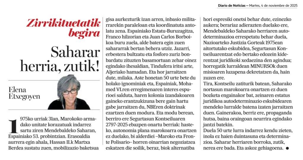 Jazarri, erbestera bultzatu eta fosforo zuriz bonbardatu zituzten basamortuan zehar oinez egindako ihesaldian, Tindufera iritsi arte, Aljeriako hamadan. Eta hor jarraitzen dute, milaka. Aste honetan 50 urte bete du holako ignominiak eta, Espainiak, Mohamed VI.ren erregimenaren interes espurioei salduta, haren kolonia izandakoaren gaineko erantzukizuna bere gain hartu gabe jarraitzen du, NBEren doktrinak ezartzen duen modura. Eta modu berean, berriro ere Segurtasun Kontseiluaren 2797-2025 ebazpen onartu berriak: hasteko, autonomia plana marokoarra onartzen ez duelako, bi alderdiei –Maroko eta Fronte Polisario– horren oinarrian negoziatzea eskatzen die soilik, beraz, biok alternatiba hori espresiki onetsi behar dute, ezinezko aukera; berariaz adierazten duelako ere, Mendebaldeko Saharako herriaren autodeterminazioa errespetatu behar duela, Nazioarteko Justizia Gorteak 1975ean aitortutako eskubidea, Segurtasun Kontseiluarentzat edo bertako edozein kiderentzat juridikoki xedaezina den agindua; horregatik lurraldean MINURSOk duen misioaren luzapena dekretatzen da, hain zuzen ere.