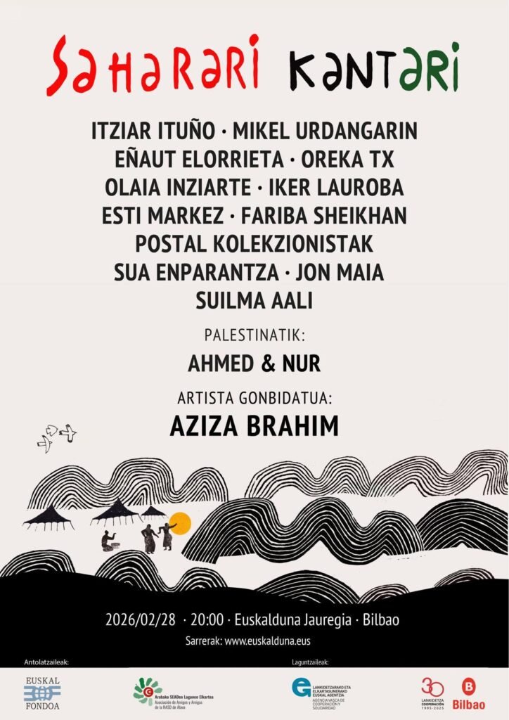 El Ayuntamiento de Bilbao colabora con el concierto “Saharari Kantari 2026” organizado por Euskal Fondoa y la Asociación de amigas y amigos de la RASD de Álava, en un evento que reunirá a más de quince artistas vascas y saharauis el próximo 28 de febrero de 2026 en el Palacio Euskalduna, para ofrecer a través de la música un lugar de encuentro entre dos pueblos y dos culturas comprometidas con la justicia y la defensa de los derechos humanos.