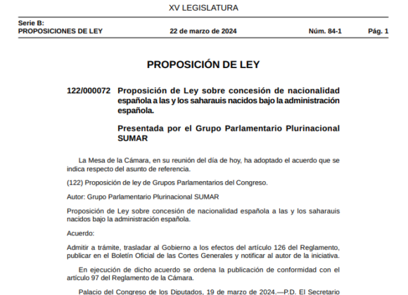 La norma se estructura en dos artículos, una disposición adicional y cinco disposiciones finales. Artículo 1. Concesión de la nacionalidad española por carta de naturaleza a las saharauis y a los saharauis nacidos en el territorio del Sahara Occidental bajo la administración de España. 1. A los efectos previstos en el apartado 1 del artículo … Sigue leyendo Se publica la Proposición de Ley de SUMAR sobre concesión de nacionalidad española a las y los saharauis nacidos bajo la administración española