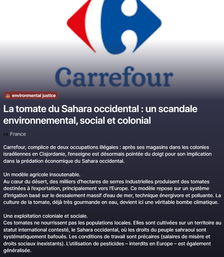 Carrefour est l’un des principaux clients de cette production. En important ces tomates, vendues dans ses supermarchés, l’enseigne cautionne un modèle agricole destructeur et une occupation illégale. Mais Carrefour a aussi le pouvoir d’agir : en exigeant des garanties éthiques et environnementales, ou en boycottant ces tomates, l’enseigne peut faire pression sur ses fournisseurs marocains pour un changement radical.