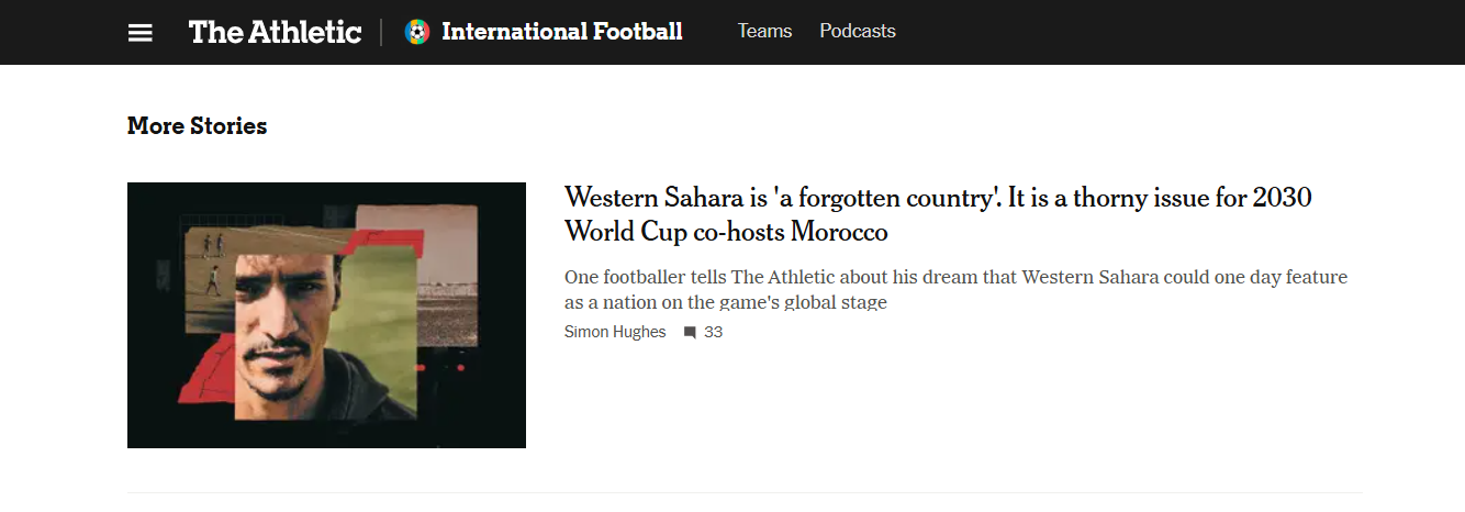 NEW YORK- El sitio estadounidense especializado en información deportiva The Athletic, vinculado al diario The New York Times, destacó este jueves, en un artículo, la cuestión del Sahara Occidental, describiéndolo como un territorio objeto de un “proceso de descolonización no completado” debido a la continuación de la “ocupación” y a la “ausencia de una solución justa”.