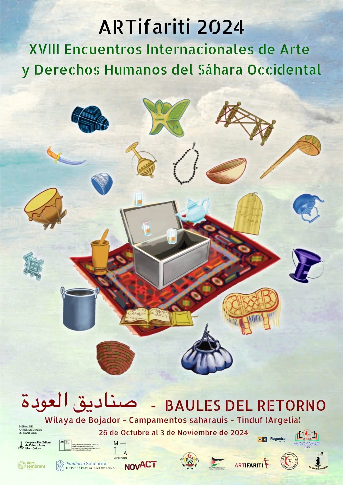 En el marco de la edición 2024 del Festival Internacional de Arte y Derechos Humanos ARTifariti, el grupo de artistas participantes creará una pieza única y profundamente simbólica, “El Baúl del Retorno”, que evocará los baúles que muchas familias saharauis construyeron cuando se preparaban para regresar a su tierra natal en el Sáhara Occidental, con la esperanza de participar en el referéndum de autodeterminación prometido durante el proceso de paz auspiciado por la ONU. Este referéndum, acordado entre el pueblo saharaui y Marruecos, sigue pendiente de realización, pero la esperanza de retornar permanece viva en la memoria de las generaciones saharauis.