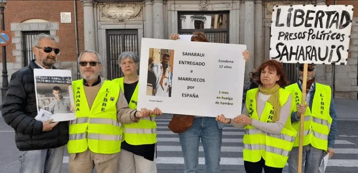 En la concentración que todos los lunes realiza el Movimiento por los Presos Políticos Saharauis (MPPS) ante el Ministerio de Asuntos Exteriores, en la Plaza de la Provincia, de Madrid, han llamado la atención sobre el caso Hussein Bachir y han reclamado al ministro José Manuel Albares la defensa de los Derechos Humanos de los reclusos saharauis.